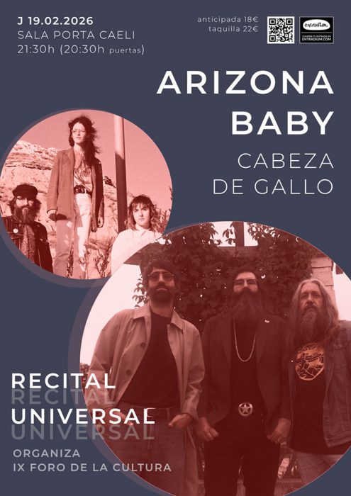 El Foro de la Cultura, que celebrará su novena edición del 19 al 22 de febrero de 2026 en Valladolid bajo el título “Pocas cosas como el Universo”, celebrará un concierto diseñado expresamente en el marco de su programa en la sala Porta Caeli. Recital Universal, una iniciativa para colaborar con el tejido musical de la ciudad. Será un concierto entre amigos que celebrará lo más universal: la música, reivindicando la cercanía, el encuentro y la creación compartida como parte esencial del espíritu del Foro. Este año serán Arizona Baby junto con Cabeza de Gallo los que inauguren este nuevo formato, el jueves, 18 de febrero de 2026, a las 21:30 horas en Porta Caeli (apertura de puertas a las 20:30 horas).