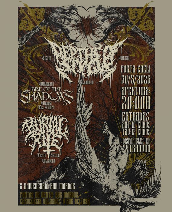 Concierto del X Aniversario del Mordor Rock Bar en el que participarán DEPTHS OF STYGIA, RISE OF THE SHADOWS y BURIAL RITE el 30 de mayo. Habrá muchos sorteos, sorpresas, etc. Además, con la entrada tendrás una consumición de hasta 3€ en el Mordor al día siguiente en el Vermú X Aniversario.